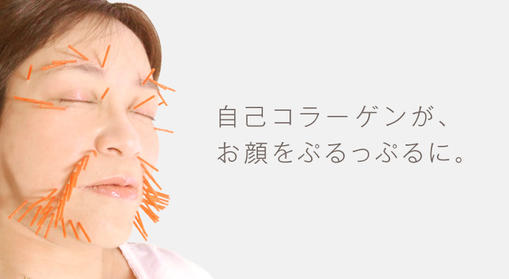 美容鍼(美容針)で真皮組織を壊して傷つけ、自分自身の修復物質で体のコラーゲンを生成させる、新しい考え方の美容鍼です。患者様ご自身の自己物質であるコラーゲンを活用するもので、長期間に渡って体内へ保留させ続けることができるのが大きな特徴です。