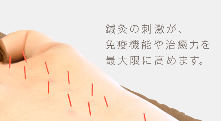 そのつぼを、鍼やお灸で刺激して心身の不調を改善する方法が鍼灸療法です。鍼や灸の刺激が自律神経や免疫作用に働きかけることで免疫機能を向上させ、お客様自身の自然治癒力を高めます。